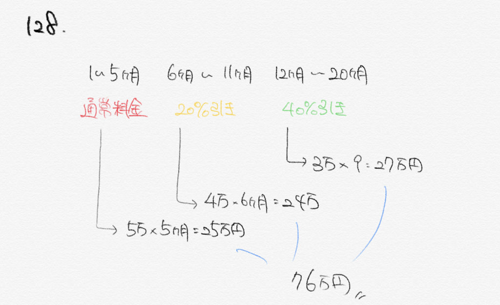 [128]あるコピー機のリース料は1ヶ月5万円が基本料金となっている。ただし、6ヶ月以上リースすると、6ヶ月目以降のリース料が基本料金の20%引き、また1年以上リースすると、12ヶ月目以降のリース料が基本給の40%引きになる。20ヶ月リースをすると、リース料金の合計はいくらか。