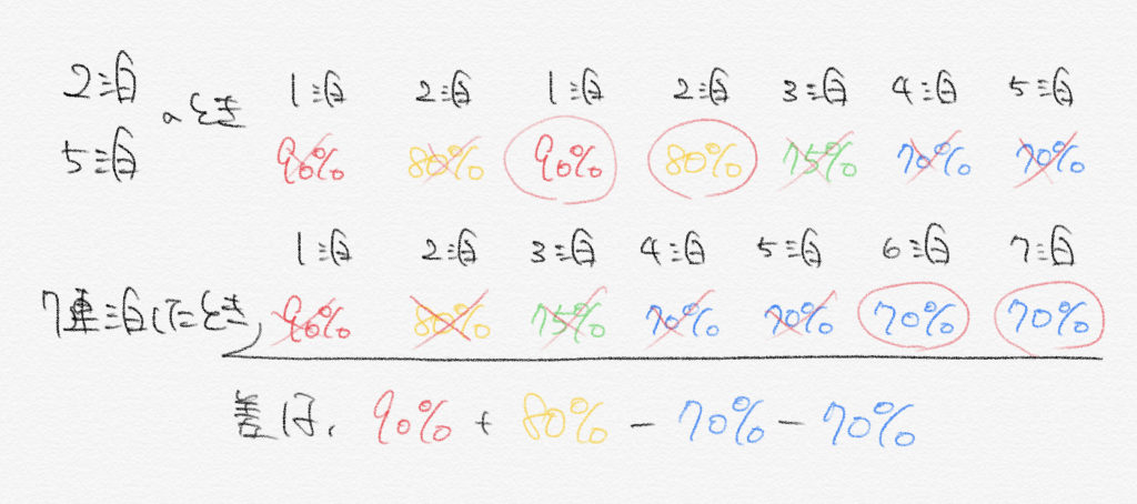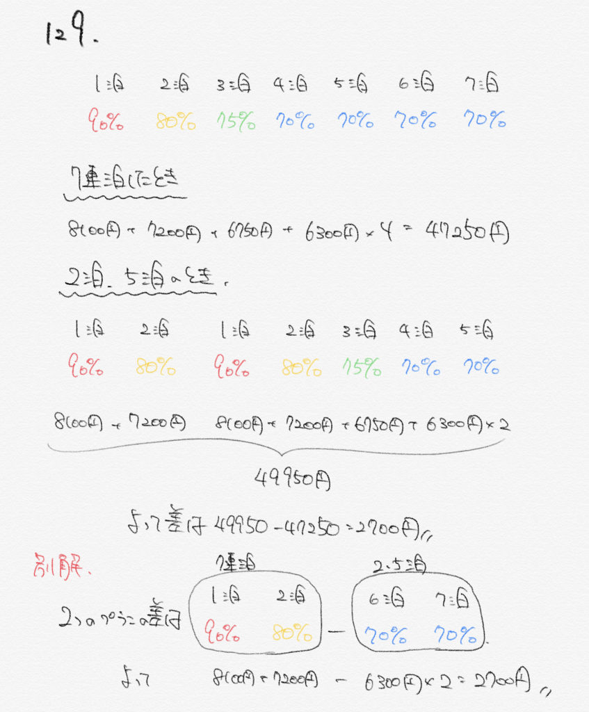[129]ある旅館では2泊以上泊まると料金が1泊目10%、2泊目20%、3泊目25%、4泊目以降30%引きとなる。1泊1人9000円の部屋に1人で7泊したい。「7連泊」する場合と、「2連泊・5連泊」に分ける場合では、料金の差はいくらになるか。