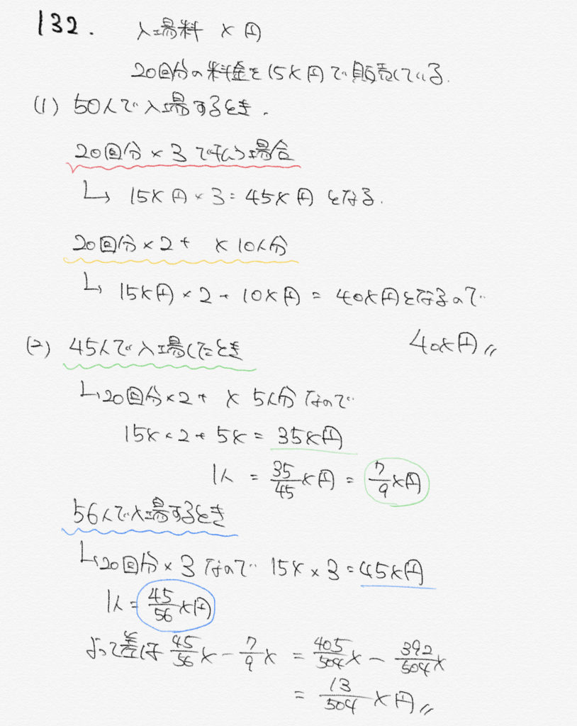 [132]ある博物館の入場券はx円である。また、切り離して使用できる20枚つづりの入場回数券を15x円で販売している。ただし、余った回数券の払い戻しはしないものとする。