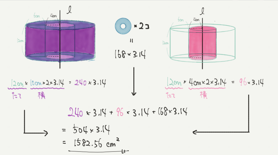 STEP1.2で、上の面+下の面=16×3.14と計算し、