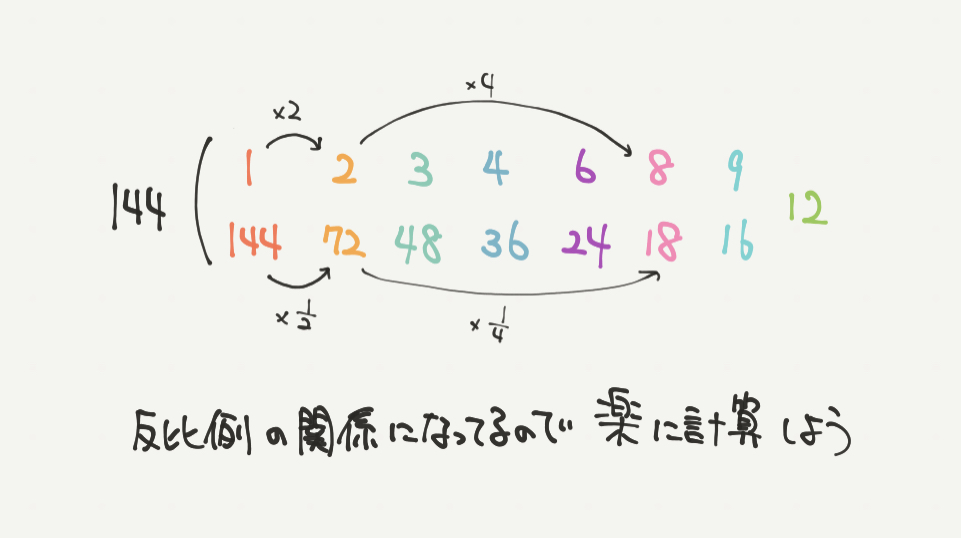 反比例を使って、1から2へ×2倍されたので、144から×1/2で72と計算できます。